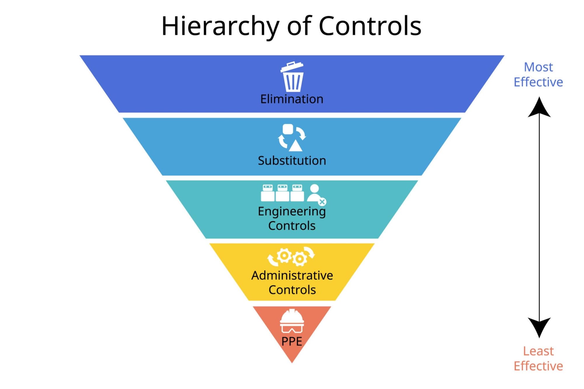 As a refresher let's define the Hierarchy of Controls. The Hierarchy of Controls is a safety framework used to choose the most effective way to control workplace hazards, starting with eliminating the hazard and ending with personal protective equipment as the last line of defense.