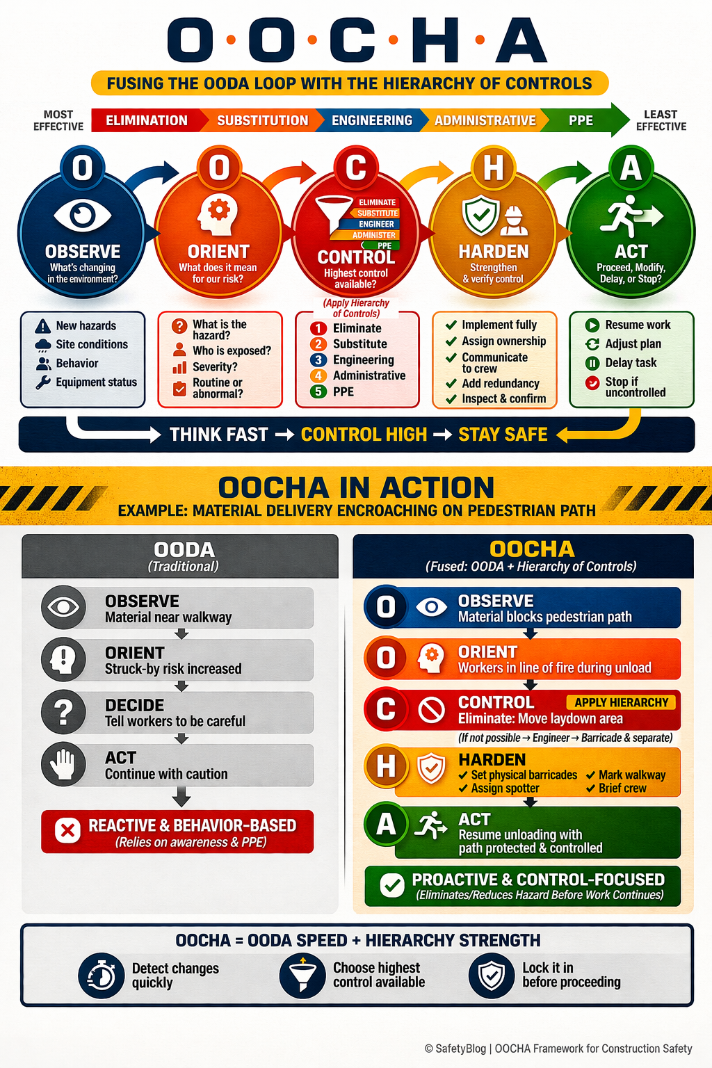 A useful way to fuse the OODA Loop with the Hierarchy of Controls is to treat the OODA Loop as the tempo of decision-making and the Hierarchy of Controls as the quality standard for the response. In this fused model, crews do not simply observe change, orient to risk, decide quickly, and act; they pause long enough to ask what level of control is actually being applied and whether the hazard can be eliminated, substituted, or engineered out before relying on procedures or PPE. One possible name for this fusion is OOCHA: Observe, Orient, Control, Harden, Act. The model keeps the speed and adaptability of the OODA Loop while forcing safety decisions through a control-effectiveness filter, helping teams respond to changing conditions with measures that are not only fast, but stronger and more reliable.