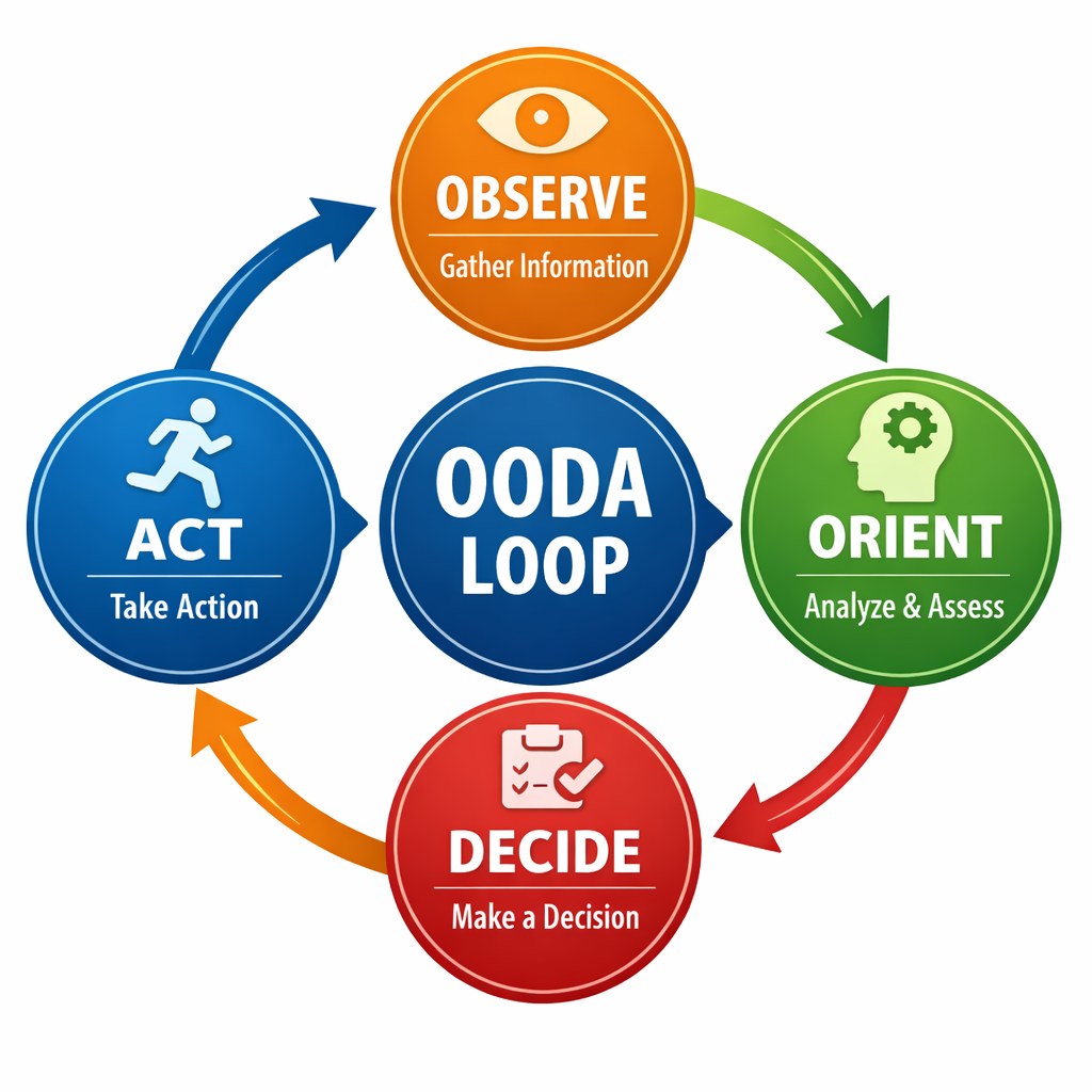 Addressing immediate hazards and a dynamically changing tactical environment is a core tenet of the Observe, Orient, Decide, Act (OODA) loop. The OODA Loop is a recurring decision cycle of Observe, Orient, Decide, and Act. It was developed by U.S. Air Force Colonel John Boyd as a model for making decisions and acting effectively in changing combat conditions.