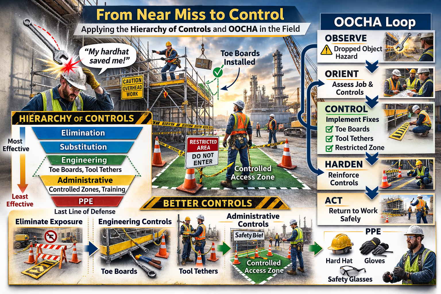 If work has already started, OOCHA helps the crew recover before an incident becomes an injury. In the Observe phase, they recognize that dropped tools are a real hazard. In Orient, they step back and assess the job, realizing toe boards are required when workers below could be exposed, but the scaffold does not have them. In Control, they notify management, request toe boards be installed as soon as possible, physically tie off the tools as an immediate engineering control, and establish a controlled access zone as an immediate administrative control. In Harden, they document and reinforce those changes so the controls stay in place. Then they Act by continuing the work under safer conditions.
